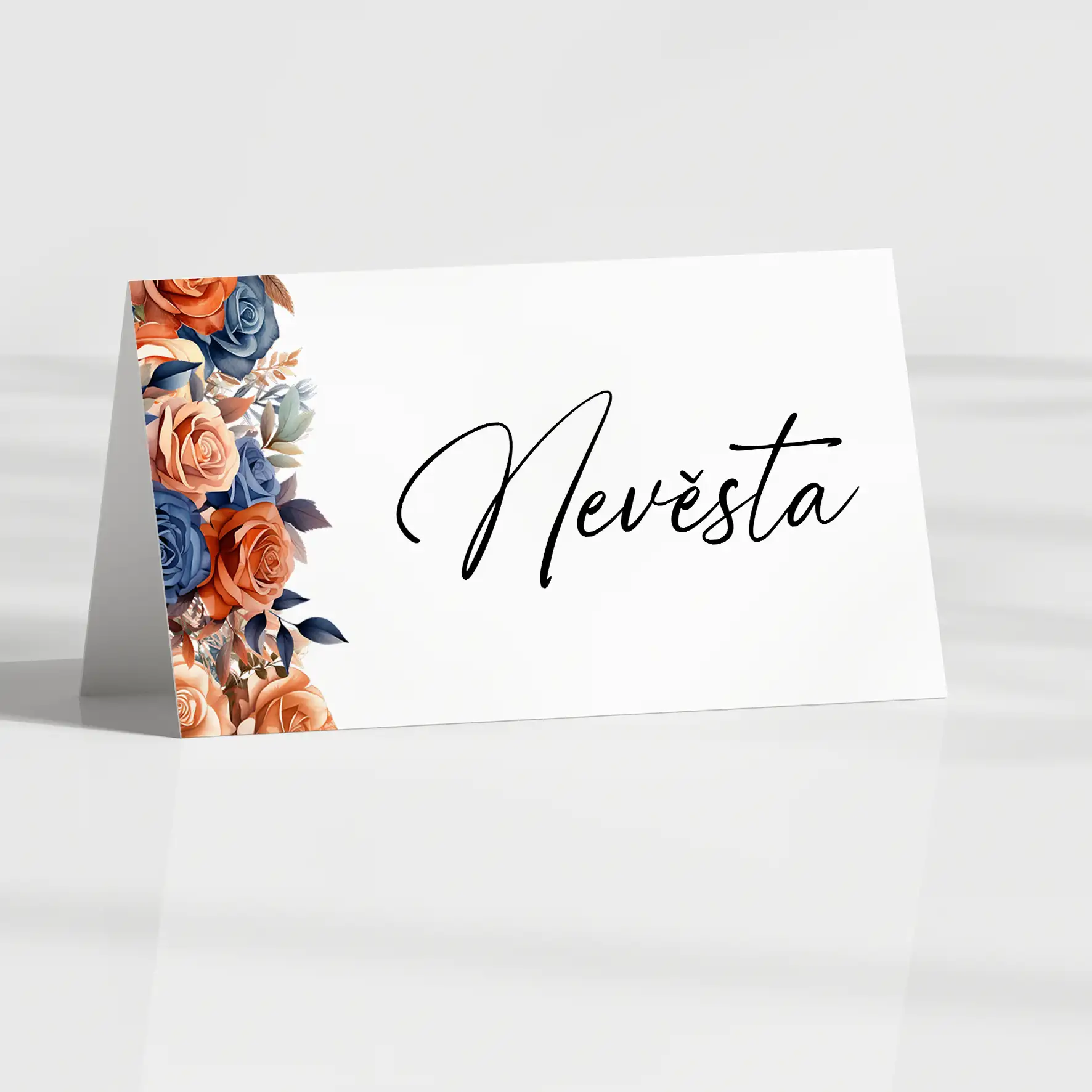 Jmenovka v motivu INDIGO A TERRACOTTA přeložena do stříšky (k postavení na stůl)