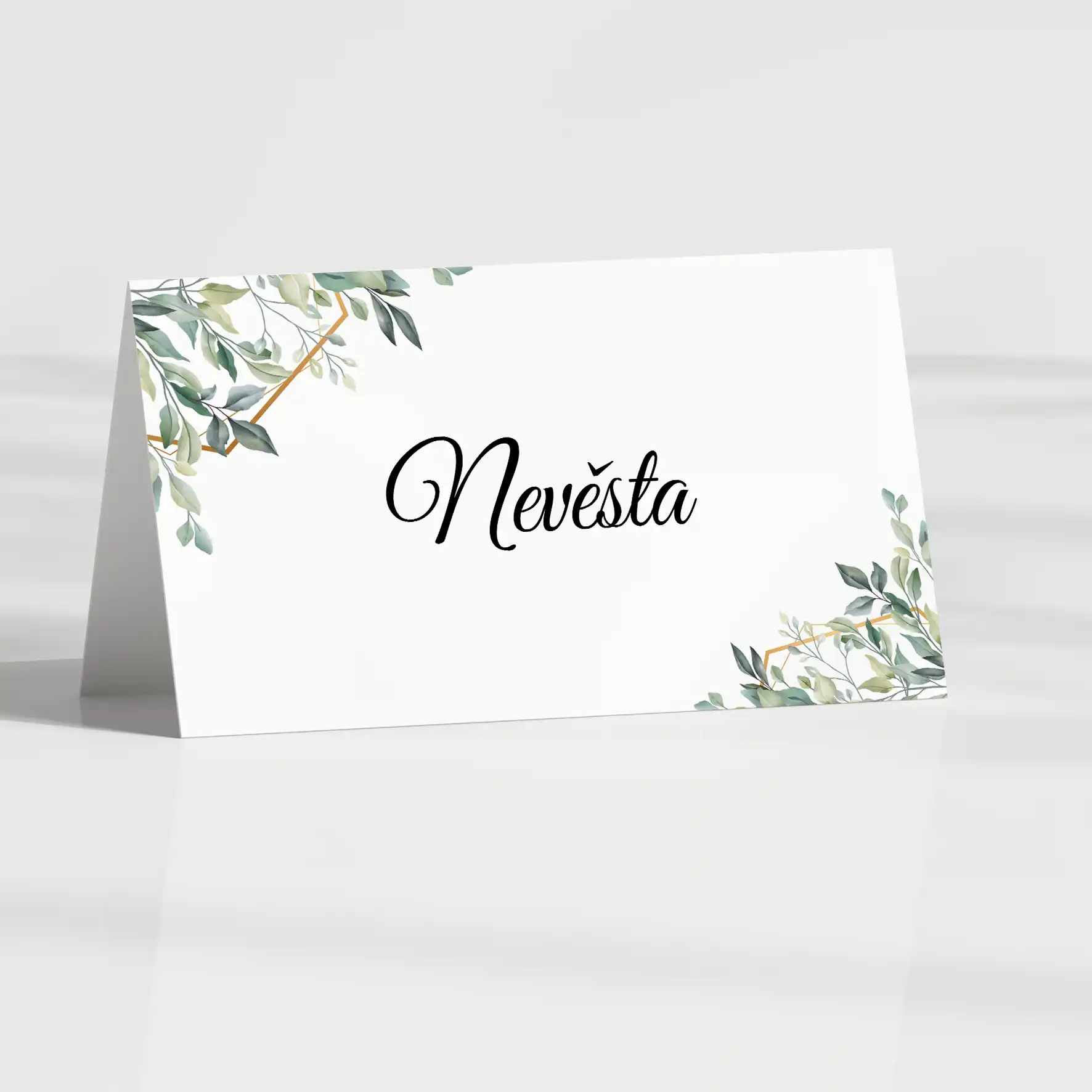 Jmenovka v motivu ZLATOZELENÁ No.3 přeložena do stříšky (k postavení na stůl)